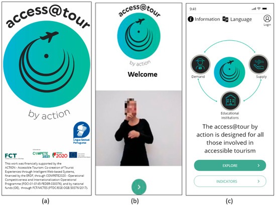 Interfaces of the initial screens of access@tour by action. From left to right: (a) the loading interface, (b) the welcoming interface with sign language support, and (c) type of user selection.
