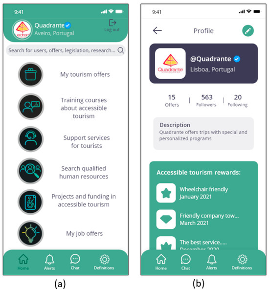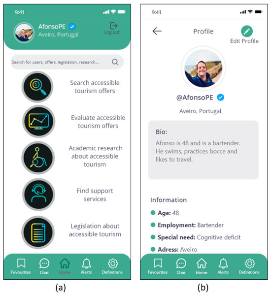 For demand agents (PwSNs, social organizations, and informal caregivers), there are various potential interactions with the platform. Users can utilize the platform to search for accessible tourism products, assess the tourism products/offers they have consumed or obtained, explore studies related to accessible tourism, discover tourism support activities, and research legislation regarding accessible tourism. In addition, a toolbar is available to users to link them with other interfaces on the system. These links include accessing the favorite tourism offers saved page, a chat interface for interacting with other users, a notification alert page, access to essential system definitions, and a Home button that allows users to swiftly return to their homepage. Additionally, at the top of the interface is a search bar for exploring various aspects of the system using keywords. The user can also access the user profile through the definition or simply clicking on the user profile image. The user profile provides an overview of the accessibility needs of the tourists and also their latest tourism experiences. The user previously inserted this information into the system so it could be stored. The interfaces demonstrating the homepage of a demand agent and a user profile are presented in Figure 4.