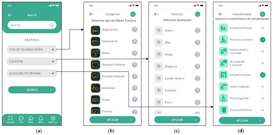 The selection of tourism products is one of the main functionalities. The user can indicate the type of tourism product, location, and accessibility criteria. The objective is for tourists to have the possibility to search for particular types of tourism activities that can fulfill their accessibility criteria. The platform was also built with the aim of being smart and adaptive, so when a tourist inserts personal information into the platform, the system is capable of recognizing those needs and offering already filtered content by automatically assimilating information regarding the users’ profile. The interfaces related to the search for tourism offers are illustrated in Figure 5.