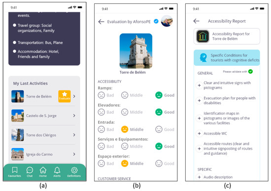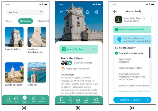 Interfaces regarding functionalities for the demand agent. From left to right: (a) accessible tourism investigation, (b) support activities, and (c) legislation regarding accessible tourism.
