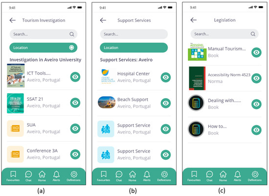 Finally, the system also allows the search for investigation and support activities legislation regarding accessible tourism (Figure 8). Investigation topics are mainly related to books and conferences related to accessible tourism. Support services address the need for specific equipment (e.g., wheelchairs, audio guides) and medical care (clinic in case of emergency). During data gathering procedures, the legislation was pointed out as an important concern for PwSNs, so the platform intends to provide access to the actual legal information regarding accessible tourism. The interfaces related to these functionalities are shown in Figure 8.
