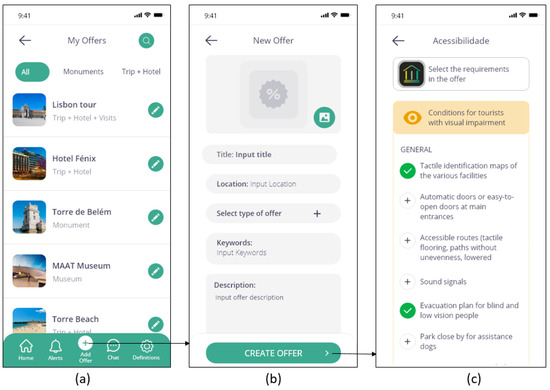 Interfaces for managing tourism offers. From left to right: (a) list offers, (b) create a new offer, and (c) insert an accessibility report.