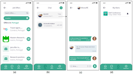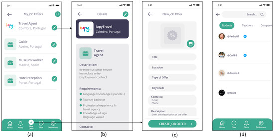The search for job offers follows a systematic process. It is essential to understand that either supply agents or tourism teachers can insert these offers into the platform. This allows the students to enter the job market or pursue a more academic career. The information available in the profile may provide significant details when researching human resources. Moreover, the students, like the other types of users, can access the chat option that allows communication between the different users supported by the platform and alerts configuration. The interfaces related to job opportunities, communication via chat between two users, and alert configuration are illustrated in Figure 17.