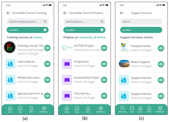 Interfaces regarding the remaining functionalities for supply agents. From left to right: (a) search for training courses in accessible tourism, (b) search for accessible tourism projects, and (c) search for support services.