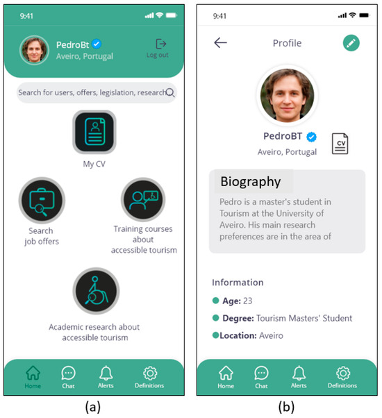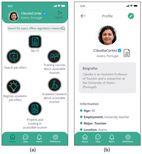 Introducing accessibility topics in tourism study programs is a relevant tool to improve accessible tourism conditions. In this regard, the platform intends to present tourism teachers with the possibility of stimulating knowledge regarding accessibility, as demonstrated in the homepage and user profile interfaces (Figure 13). On the homepage for tourism teachers, it is possible to insert their CV into the platform, search for employment positions (such as university teaching roles) or post-employment opportunities, seek training in the field of accessible tourism, explore academic research studies, and discover projects related to accessible tourism, as well as funding programs. The insertion of the CV is important because it allows the user to share information related to accessibility work. The user profile interface contains information regarding academic research and direct access to the inserted CV by clicking on the respective buttons. Ultimately, incorporating this type of user aims to cultivate an academic interest in the research area of accessible tourism.