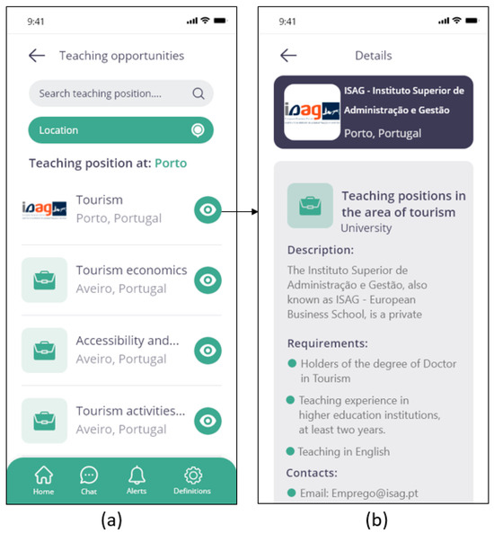 An exciting functionality available for tourism teachers is the search for teaching jobs and the insertion of research employment positions for interested students. This available interaction with the platform intends to illustrate how the platform can be self-sufficient, as the users can insert information inputs and retrieve information outputs. As illustrated in Figure 14, the access@tour by action allows teachers to search for teaching positions in higher education institutions.