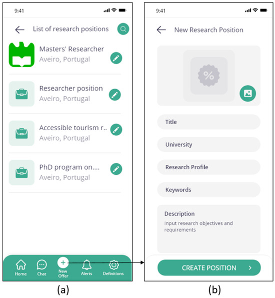 Interfaces for inserting research positions. From left to right: (a) list of research positions, and (b) add a new job offer for a research position into the system.