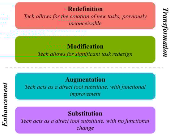 The SAMR model categorizes the degree of technology integration into two ranges and four levels within each range (see Figure 1). This classification reflects the view that technology integration in education falls into one exclusive category [40]. The substitution level is a situation in which technology is used to directly substitute for traditional methods without functional or conceptual changes, such as transferring the learning content to be taught through technology. In the augmentation level, technology substitutes for traditional teaching methods, but with functional improvements. It is possible to change small-scale improvement, which does not imply strong changes to teaching and learning at this level. In the modification level, technology allows for the redesign of typical lesson goals, activities, and tasks. Physical barriers in the classroom are eliminated as students’ expressions of their positions become more flexible and closer to learning that occurs in a variety of contexts. Finally, the redefinition level is the use of technology for learning in ways that could not be implemented without technology. Two levels at the bottom represent using technology to enhance learning, and two levels at the top represent using technology to transform learning.