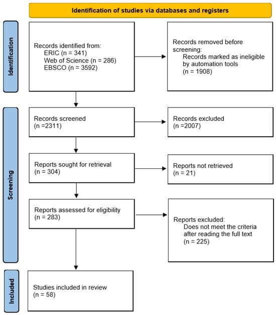 According to the established inclusion and exclusion criteria, the title and abstract of the paper were reviewed, and the full text was secondarily reviewed. In the first screening, two separate reviewers read the titles and abstracts of all papers and coded them into three groups: (a) included, (b) ambiguous, and (c) excluded. Both reviewers had extensive publishing experience in performing coding. Coding agreement between reviewers was found to be 92%, and papers that did not receive the same coding reached 100% agreement through discussion. An initial review of 2311 studies resulted in the removal of 2007 articles. The remaining 304 articles were retrieved in full text for Stage 2 screening and evaluated by two reviewers. In this process, 21 articles in which the full text was not freely retrievable were excluded. In addition, 225 articles were excluded because the contents of the full text referred superficially to mathematics education or focused on the development process of ITSs rather than the context of mathematics education. Ultimately, 58 articles were identified as meeting the current study goals. The literature search and review procedure based on PRISMA is presented in Figure 2.