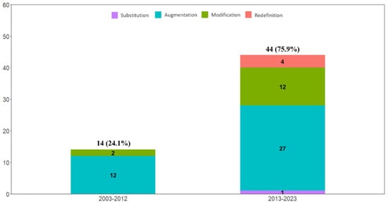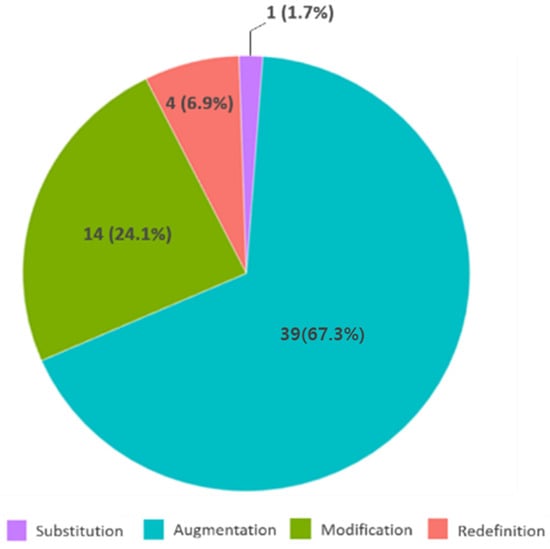 The redefinition level comprised 6.9% (n = 4) of all articles. Matsuda et al. [60] used SimStudent, which enables learning by teaching, to provide students with an artificial peer learning environment. The ITS acted as a student seeking learning, and the student learned by teaching the ITS. Implementing such learning is impossible without technology, as real-world educational contexts cannot produce students with the same level of knowledge and background.