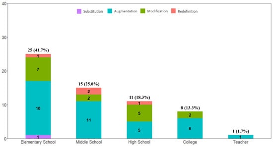 Figure 6 shows the distribution of SAMR levels across educational levels covered in the reviewed literature. Some studies ([61,62]) applied ITSs to multiple educational levels, so 60 educational levels were included. The most ITS research was conducted in elementary school at 41.7% (n = 25), followed by middle school at 25% (n = 15), high school at 18.3% (n = 11), colleges at 13.3% (n = 8), and teacher at 1.6% (n = 1). Most studies were conducted in the context of K–12 mathematics learning; however, there was no ITS study conducted at the Pre–K educational level, and the fewest ITS studies were conducted for teacher education.