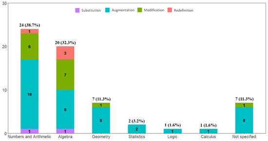 Figure 7 shows the distribution of SAMR levels across the mathematics domains. The reviewed studies covered six content domains of mathematics education. Most studies were conducted around the domains of numbers and arithmetic (38.7%), algebra (32.3%), and geometry (11.3%). Seven studies classified as ‘Not specified’ did not explicitly describe to which mathematical domain the ITS was applied. In some studies, the ITS applied to multiple domain contexts (e.g., [12,64]), and the total number of mathematical domains was 62. For example, Chang et al. [12] applied ITSs to multiple domains, such as the operation of fractions, the area of triangles, and unit cost.