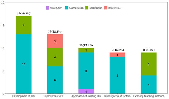 All four levels of the SAMR framework were identified in the reviewed 58 studies (see Figure 3). The substitution level comprised 1.7% (n = 1) of the total article. The ITS substituted for the teacher’s role without functional improvements at this level, such as presenting problems to students and providing feedback. For example, del Olmo-Muñoz et al. [14] used an ITS called HINTS (Hypergraph-based INtelligent Tutoring System) to address the gap in low-income households. Students solved practice problems provided by the system, read solutions, or solved similar additional problems. To prevent students from relying on messages from the ITS, aids on-demand was prevented. This did not seem to have any added value compared to teachers giving students worksheets with practice problems and providing additional feedback.
