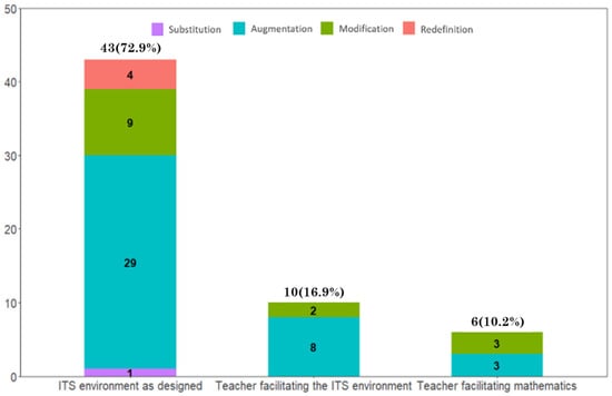 Figure 9 shows the distribution of SAMR levels across teachers’ roles. One ITS study for teachers was excluded from the analysis [72]. Some studies reported diverse roles for teachers [66,73]. For example, Phillips et al. [73] reported that although teachers were encouraged to consider different models for blended learning, most teachers did not intervene in ITS learning, and only some teachers integrated ITSs into mathematics learning. As a result, a total of 59 papers were analyzed. The teacher’s role is predominantly one of managing or not intervening in learning between students and ITSs (72.9%). There were 16.9% (n = 10) of studies in which teachers played a role in facilitating learning between students and the ITS, and the role of teachers in leading ITS learning and connecting ITS learning with external mathematics activities accounted for the lowest percentage of all studies (n = 6; 10.2%). These results implicitly reveal the dominant perspective that ITSs can replace the role of teachers in mathematics education.
