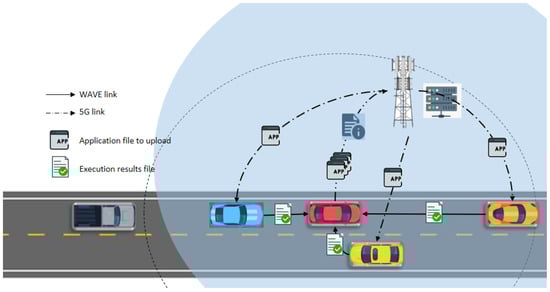 - We employ both communication technologies in our approach. 5G technology, specifically V2I (Vehicle-to-Infrastructure) communication, is used to offload tasks from the edge server to specific nodes, while WAVE (Wireless Access in Vehicular Environments) in V2V (Vehicle-to-Vehicle) mode is used to relay the results of tasks completed remotely by selected vehicles. This dual communication strategy maximizes the potential of the VEC system.