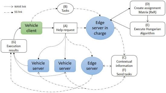 Figure 2 illustrates the proposed system, where the client initiates the process by (A) broadcasting a help request to neighbouring vehicles using WAVE and to edge servers via the 5G interface. The client then selects a specific edge server to manage the offloading of tasks. In step (B), the tasks requiring remote execution are transmitted to the designated edge server through the 5G interface. Available nodes respond to the help request by sending their contextual information to the responsible edge server. In steps (D) and (E), the edge server creates a square matrix and calculates the costs associated with task execution. The Hungarian Algorithm is then applied to determine the optimal task assignment. In step (F), the tasks are transferred to the assisting nodes via the 5G interface from the responsible edge server. This communication method is significantly faster than the WAVE communication used between vehicles []. Finally, in step (G), the assisting nodes execute the tasks and return the results directly to the client—via WAVE if the node is a vehicle, or via 5G-BS if the node is an edge server.