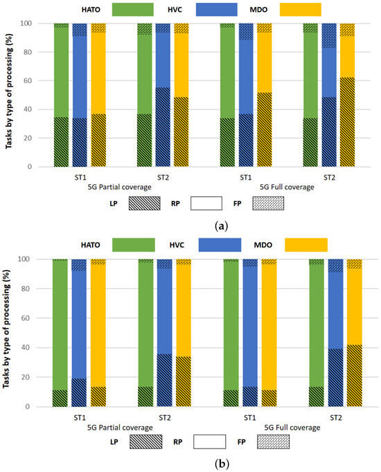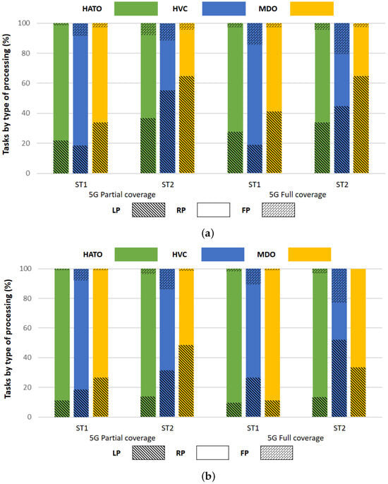 In the urban scenario, as shown in Figure 3a,b, HATO achieves a high offloading percentage of 87.75% in high-density areas with workload ST1, while maintaining the lowest failed processing rate at 1.13%. The MDO algorithm performs better than HVC but still falls short compared to HATO. For highway scenarios, as illustrated in Figure 4, HATO excels in minimizing locally processed tasks (LP), though it ranks second in failed cases (FP). The highest failure rate of 7.93% occurs for remotely processed tasks (RP) on low-density highways under partial 5G coverage (Figure 4a). Overall, HATO proves to be the most reliable for RP workloads, owing to its improved decision-making process.