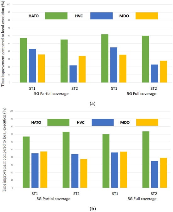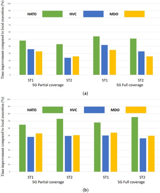 Figure 5 and Figure 6 depict the results for urban and highway scenarios, respectively, with a 5% margin of error. In urban areas (Figure 5), HATO significantly outperforms HVC and MDO in reducing execution latency, achieving a maximum improvement of 75.4% in high-density urban areas (Figure 5b) under full 5G coverage. In highway scenarios (Figure 6), HATO demonstrates substantial improvement in determining assignment schemes and reducing execution time, with a gain of 74.1% in high-density areas (Figure 6b) under full 5G coverage. In all scenarios, HATO outperforms both HVC and MDO in terms of execution time reduction.