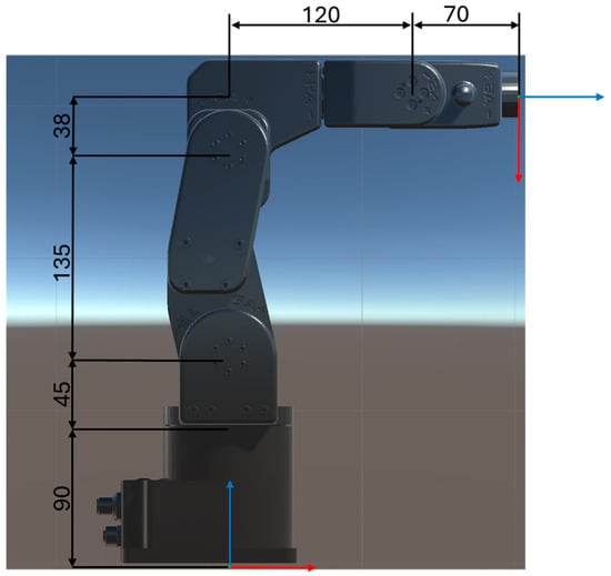 Figure 1 shows the imported robot model in Unity with the joint dimensions and end effector orientation displayed over it. The Denavit–Hartenberg (D-H) parameters in