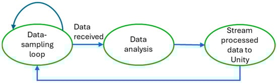 Figure 4 shows the process the simulators used to sample for new data. The first stage is a continuous loop surveying the communication method for new data and verifying the correctness of the data. The data analysis for the respective simulator is then initiated once the data are received and verified. The final stage sends the processed data to Unity and restarts the data-sampling loop.