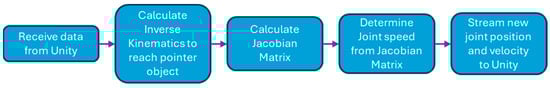 Figure 5 shows how MATLAB analyzes the data from Unity. In this process, MATLAB receives the Unity Robot joint angles and user object XYZ coordinates. This process initially receives the robot joint angles and user object XYZ coordinates from Unity. Afterwards, it uses these data to compute the inverse kinematics and its Jacobian matrix. Then, it determines the velocity magnitude for each joint from the Jacobian matrix. Finally, it streams the velocities and new joint positions to Unity.