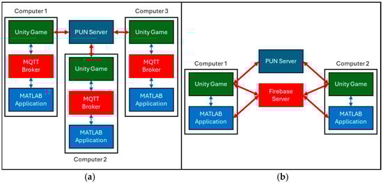 Figure 8a shows that each computer only connects to the PUN remote server and handles the remaining processes internally. The Unity-MATLAB communication process in each computer is isolated from the other systems connected to the PUN server.