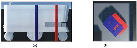 The Reeman mobile robot model (Test B) was tested in two steps: (1) a test for the motion, and (2) a test for the LIDAR. Robot motion was tested by moving the digital model in straight lines, curves, and sharp turns, and then comparing the differences in trajectories with recordings of the real robot. This test uncovered an issue where the simulated robot’s turn point was located at the front wheels (red line in