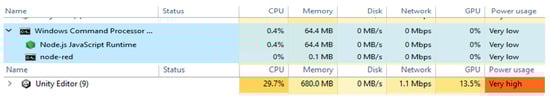Figure 14). This low usage in contrast with the unity editor is due to the simulator running without the overhead from the Unity editor.