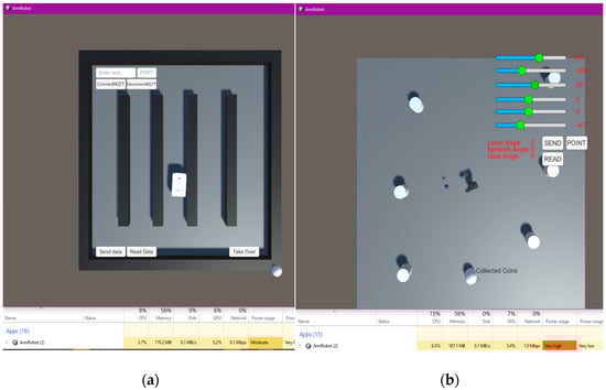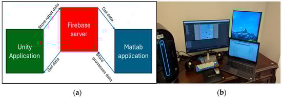 Table 4, the Meca500 application did not create a heavy load due to its small dataset used and the more manageable calculation process. In contrast to this, the Reeman application had high resource utilization because of the frequent sampling of the large dataset generated by the LIDAR and the calculations required to process the data. This high usage was handled well by both computers, but it raised concerns about the viability of simulation with Unity and MATLAB simultaneously for less powerful computers. This can impact users such as students or schools who may not have access to higher-capacity systems but still want to execute large simulation models. This issue was solved by using Firebase to offload the computations to a more powerful remote computer. To accomplish this, the user must load the Unity and MATLAB applications on separate computers and then connect them to the Firebase server. The test results (