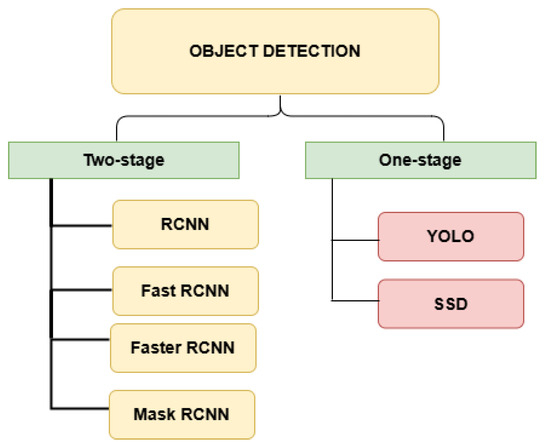 Based on the number of times a similar input image is sent through a network, object detection methods are separated into one-shot and two-shot algorithms. Two-shot algorithms were proposed earlier, including R-CNN (Region-based Convolutional Neural Networks) [6], Fast R-CNN, and Faster R-CNN [7]. Many optimization approaches follow Faster R-CNN, such as enhanced feature networks, improved RPN, improved ROI classification, sample post-processing, larger mini-batch, etc. [8], resulting in today’s famous R-FCN and Mask R-CNN algorithms [8]. Two passes of the input image are used in two-shot object detection to determine the existence and location of objects. In the first pass, a series of predictions or possible object positions is produced, these predictions are refined, and final predictions are made in the second run. Although this method is computationally more expensive than single-shot object detection (Figure 1), it is also more accurate [9].