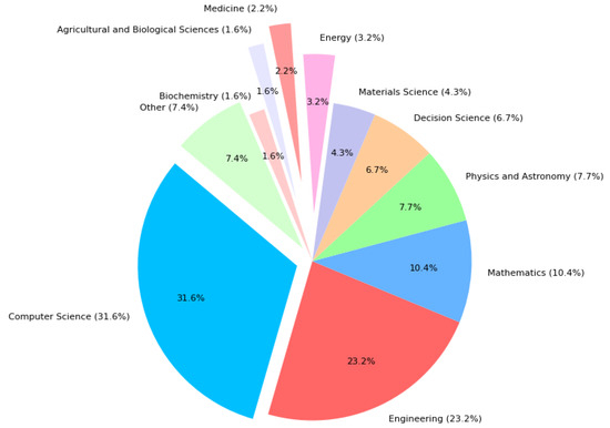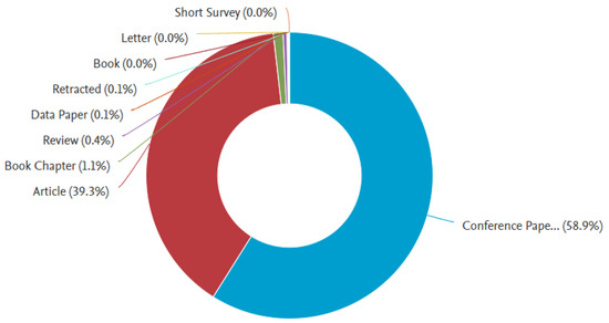 The study also analyzed the search based on the type of document. The analysis revealed that the highest percentage of authors presented their work through conference papers (58.9%). In total, 39.9% were published as articles, while the remaining were book chapters, reviews, books, letters, and data papers. Our analysis also revealed that 0.1% of the works were retracted. This indicates a need for this review, as reviews only made up 0.4% of the works since 2020.