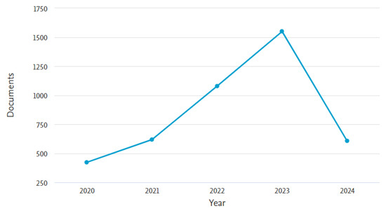 The publication of documents increased significantly from 2020 to 2023, and the maximum number was found to be from 2023. The documents reported a downward surge in the year 2024, which is significantly lower than in 2023. However, it is much better than what was reported in 2021 and even 2020. From 2020 to 2021, 46.34% more documents were published with an increase of 196 documents. From 2021 to 2022, 74.31% more documents were published, totalling an increase of 460. From 2022 to 2023, 43.56% more documents were published, thereby increasing by 470. From 2023 to 2024, 60.87% less work was conducted, with 943 declining in document publication. We observed that 2023 is the year that reported the maximum number of documents. This might depict high research activity or more activity in terms of data collection. The decline in 2024 is not good, and this might be because there was possibly a trend reversal or diminishing research activities. However, it may be just because the year has not ended yet, and in the course of the year, the number of documents will most likely increase. From the overall comparison with the year 2020, the overall trend from the year 2020 to 2024 speaks of the growth in the documents. This indicates the need for more research in this area. Table 2 is represented as a graph in Figure 4 to clearly depict the surges over the years.