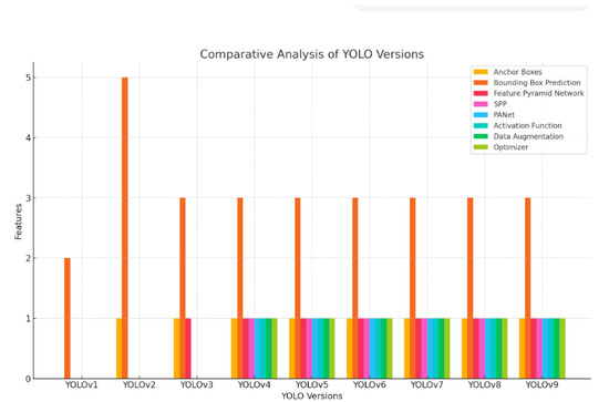 The features shown in the bar chart are anchor boxes, bounding box prediction, feature pyramid network, SPP (Spatial Pyramid Pooling), PANet (Path Aggregation Network), activation function, data augmentation, and optimizer. Each bar represents the presence (1) or absence (0) of a feature, except for bounding box prediction, which is represented by the number of bounding boxes per scale.