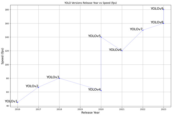Speed was another aspect through which each of these versions experienced improvements. The graph in Figure 8 illustrates the relationship between the release year and speed (in frames per second) for various YOLO versions: YOLOv1 (2016): 45 fps, YOLOv2 (2017): 67 fps, YOLOv3 (2018): 80 fps, YOLOv4 (2020): 65 fps, YOLOv5 (2020): 140 fps, YOLOv6 (2022): 120 fps, YOLOv7 (2022): 150 fps, YOLOv8 (2023): 160 fps, YOLOv9 (2023): 180 fps. It was observed that there is a general trend of increasing speed over the years as the YOLO versions progress, reflecting improvements in efficiency and performance.