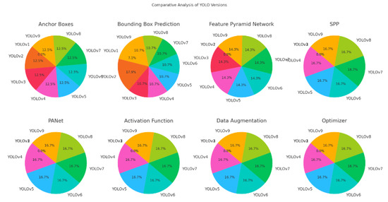 The pie chart in Figure 9 represents the percentage distribution of each of the described characteristics in each of the YOLO versions.