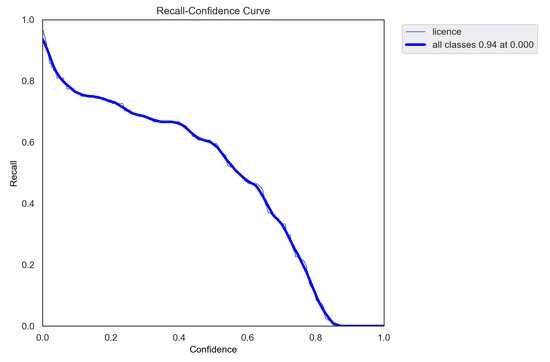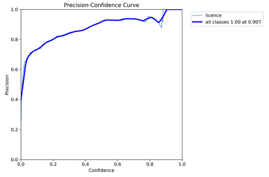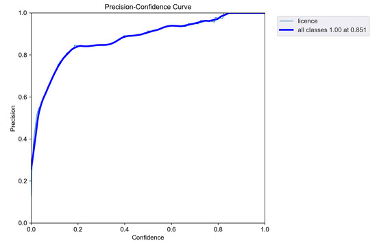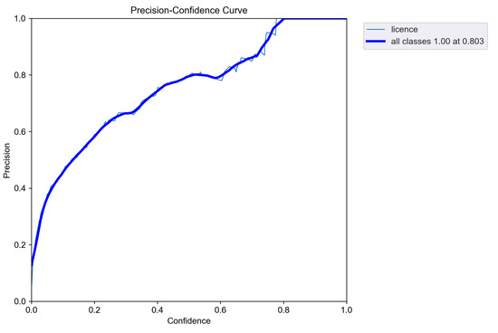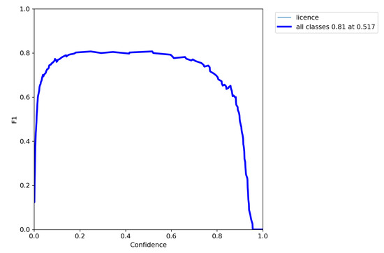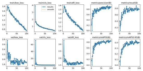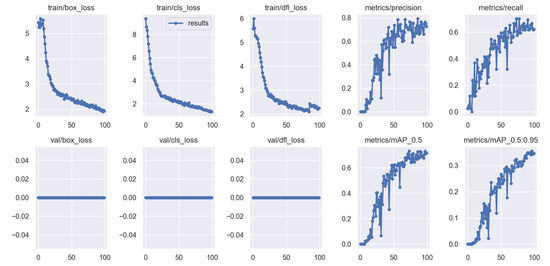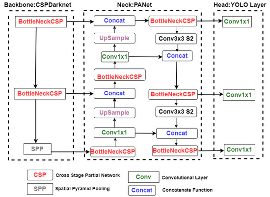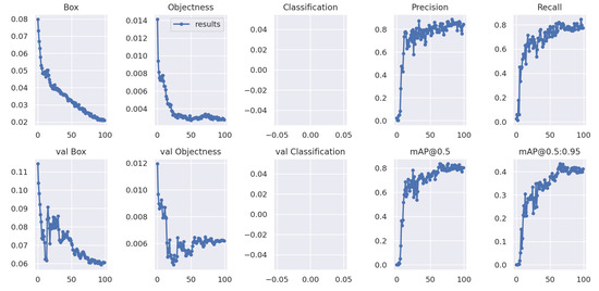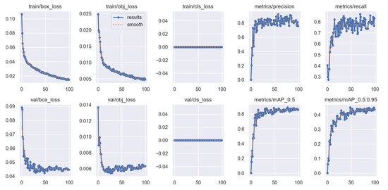where indicates the likelihood of the object being present, with a range of 0–1, and represents the intersection-over-union with the predicted bounding box with regard to the ground truth bounding box. The components of each bounding box are . The notation represents the bounding box’s center coordinates () [32].