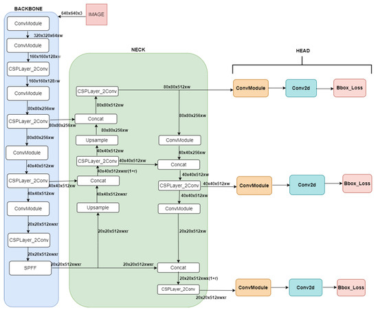 YOLOv5, specifically, was released by Ultralytics and was not an official update from the original creators of YOLO. YOLOv5 is a widely used object detection algorithm. With progressively higher accuracy rates, YOLOv5 comes in four main variants: small (s), medium (m), large (l), and extra large (x). Every version has a different training time as well. YOLOv5’s architecture is made up of three main components: First, the backbone, which extracts features using CSPDarknet. The second is the neck, which fuses features utilizing PANet. Lastly, the YOLO layer, which represents the head, produces the detection results and provides class labels, confidence scores, item locations, and sizes [43]. This structured architecture enables YOLO to efficiently perform object detection tasks with high levels of accuracy and efficiency [44]. Figure 10 shows the architecture of YOLOv5.