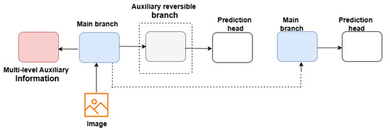 Using the transformation function r and its inverse v, the mutual information I moves through all the levels while maintaining its initial input J. Under-parameterization in lightweight models restricts their ability to process substantial volumes of unprocessed data, leading to significant information loss and affecting the performance [51]. To address this, a new training method called Programmable Gradient Information (PGI) was developed in [50]. PGI includes a main branch for inference, accurate gradient computation, an auxiliary reversible branch, and multilevel auxiliary information, effectively addressing deep supervision concerns without increasing inference costs. Figure 13 shows the PGI architecture.