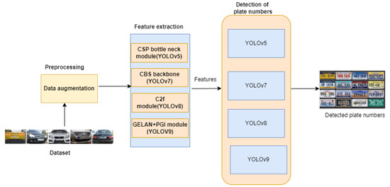In this study, we will consider four versions of YOLO, namely YOLOv5, YOLOv7, YOLOv8, and YOLOv9, for vehicle license plate detection (specifically, versions 5 (large), V7, 8 (large), and 9 (compact) variants). This study uses YOLOv5, YOLOv7, YOLOv8 and YOLOv9 for vehicle license plate detection due to their improvements in accuracy, speed, and feature enhancements. YOLOv5 is ideal for real-time object detection tasks, with its smaller model size and efficient inference times. YOLOv7 offers optimizations in speed and accuracy, improving performance in complex environments. YOLOv8 improves feature extraction, anchor-free design, and generalization, allowing for more accurate detection in diverse lighting conditions. YOLOv9 builds on these strengths, offering cutting-edge performance. The different architectures of each of these versions are described in Section 4.1, Section 4.2, Section 4.3, and Section 4.4, respectively.