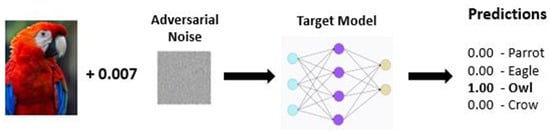Adversarial examples, as explained in Figure 4, are inputs to machine learning models that are intentionally perturbed to cause misclassification. Small but carefully crafted changes could lead to incorrect predictions with high confidence. The authors in [33] explored the susceptibility of neural networks to adversarial examples, which were slight perturbations of the input data that caused models to make high-confidence misclassifications. Contrary to previous beliefs that nonlinearity and overfitting were the primary causes, the authors argued that the linear nature of neural networks was the main reason for this vulnerability. They introduced the “fast gradient sign method” to efficiently generate adversarial examples, leveraging this linear behavior.