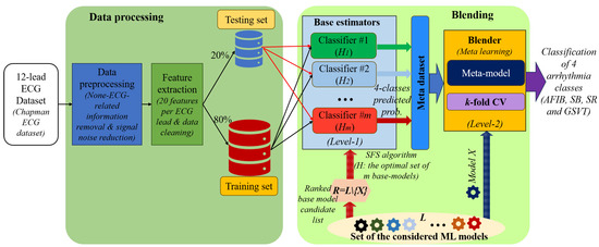 Our proposed blending framework can efficiently classify multiple arrhythmia types using 12-lead ECG signals by exploiting blending, incorporating a sequential forward selection of base models. The use of the sequential forward selection strategy helps to minimize the number of base models and eliminate unnecessary ones while ensuring the highest performance. This results in a simpler algorithm complexity and makes the proposal more feasible to apply in practical environments. The blending framework also employs meta-feature augmentation with a meta-dataset created based on the outputs’ of the optimal base models. By performing comprehensive experiments on the given fundamental machine learning algorithms, all possible blending configurations were investigated to determine the most efficient solution.
