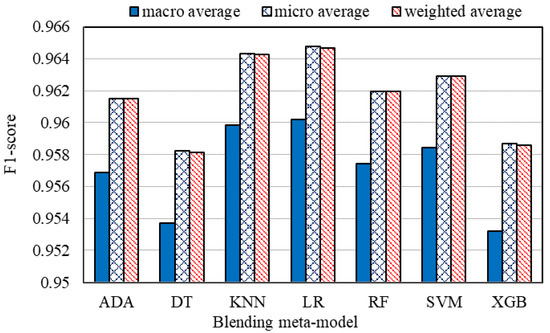 In addition, Figure 4 shows the F1-score comparison of the optimal blending configuration with different meta-models. The graphs of three averaging F1-score metrics (macro, micro, and weighted), of seven blending ensembles with the meta-models of ADA, DT, KNN, LR, RF, SVM, and XGB demonstrate that the blending ensemble with the LR meta-model consistently performs best across all metrics with scores around 96.4%, while that of XGB shows relatively lower performance with scores around 95.3–95.8%. The micro and weighted averages generally show higher scores than macro averages across all models, suggesting better performance on more frequently occurring classes.