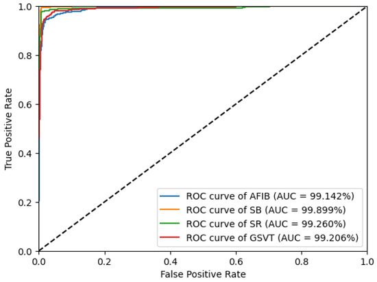 Based on the above observations, the blending design, which is proposed for the classification of four arrhythmia types in this work, contains an LR meta-model and a subset of three base models selected from the given seven fundamental machine learning algorithms. Here, the LR meta-model combined with the CV procedure is implemented with different k values, ranging from 3 to 10. The value of k for which the blending model produces the highest classification accuracy is selected as the optimal parameter. The performance of the proposed blending ensemble with the LR meta-model is given in Table 3. The proposed blending model demonstrates excellent performance in classifying four types of arrhythmia, with SB achieving the highest accuracy of 99.25% and the best F1-score at 99.49%, followed by SR with a 98.92% accuracy and 97.53% F1-score. The classes of AFIB and GSVT also show strong performance with accuracies of 97.23% and 97.56%, respectively, and F1-scores above 93+%. The model’s overall performance is robust, as evidenced by consistently high macro (96.02%), micro (96.48%), and weighted (96.47%) averages across all metrics, including Precision, Recall, and Specificity, indicating reliable and balanced classification capabilities across all arrhythmia types. Additionally, the ROC-AUC curves of individual classes are also illustrated in Figure 5. Our developed model attains a significant AUC for all classes, where the highest AUC of 99.899% is achieved for the SB classification and the lowest AUC of 99.142% is for that of AFIB.