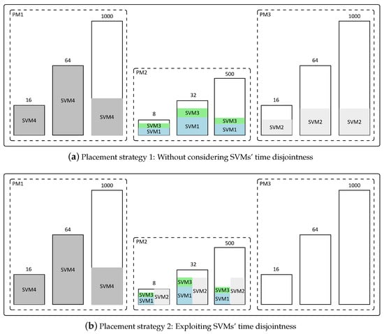 - Non-overlapping SVMs sharing resources: If two SVMs and do not overlap in time (), they can share resources on the same PM: