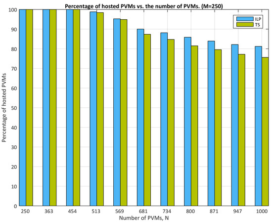 - These results suggest that TS and ACO scale more effectively with increasing SVMs than PSO, which struggles to maintain hosting percentages as N rises. TS and ACO are better at exploiting the time disjointness of the SVMs to optimize resource utilization on each PM, likely due to more efficient packing of multiple SVMs on the same PM by considering their time windows. In contrast, PSO may not explore the solution space as effectively, possibly leading to premature convergence or under-utilization of available PM resources over time.