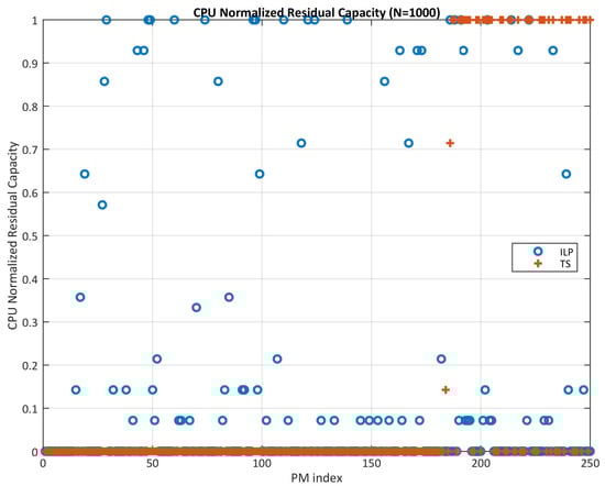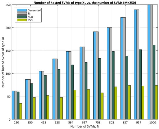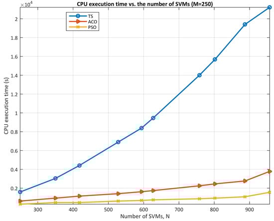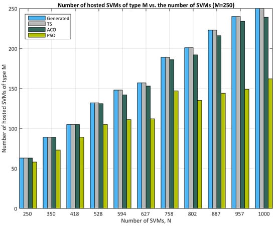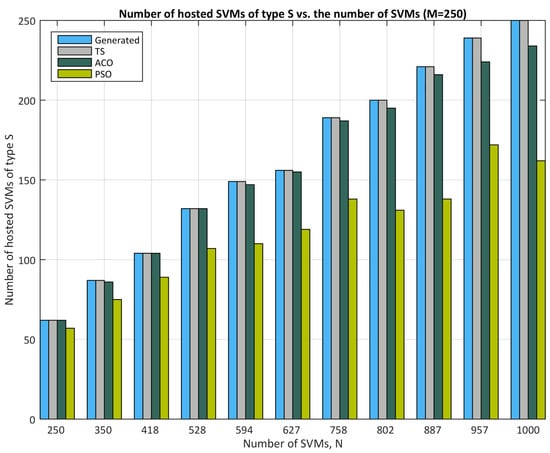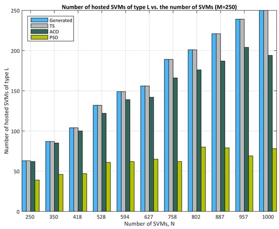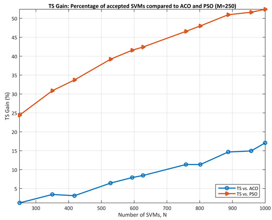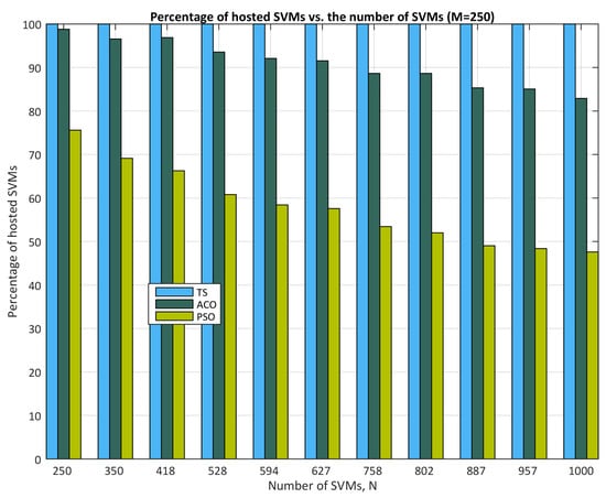 - As the number of arriving SVMs grows, PSO experiences a sharper decline in hosted SVMs compared to TS and ACO. For instance, at N = 250 arriving SVMs, all three algorithms perform similarly (∼100% hosted SVMs). However, as N increases further, PSO hosts only around 60–70%, while TS and ACO maintain near-full capacity.