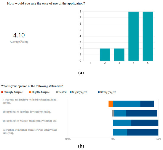 Regarding the ease of use, 80% of participants rated the app as easy or very easy to use, with a mean score of 4.10 over 5.00 (Figure 10, panel a). Participants’ feedback on the app’s usability was generally positive, particularly concerning the visual interface, with 70% strongly agreeing that the interface was intuitive (Figure 10, panel b). Interaction with virtual characters was well-received, with 70% strongly agreeing and 30% somewhat agreeing that it was enjoyable. Furthermore, 60% found the app fast and responsive. However, 10% of participants reported difficulties navigating the app.