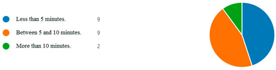 Most users (90%) became familiar with the app within 10 min, with 45% requiring less than 5 min and another 45% between 5 and 10 min (Figure 11). Additionally, 80% did not need assistance when using the app for the first time.