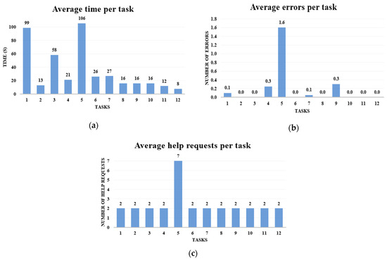 Regarding gender, no significant differences were found in task completion time (6 min and 53 s for females and 7 min for males) or in the average number of errors (2.3 for both genders). Male participants requested an average of 1.5 help requests compared to 1.4 for females, a negligible difference.