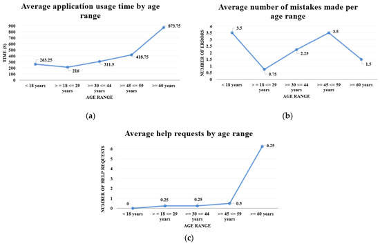 (a) Average time per age range; (b) average number of errors per age range; (c) requests for help by age range.